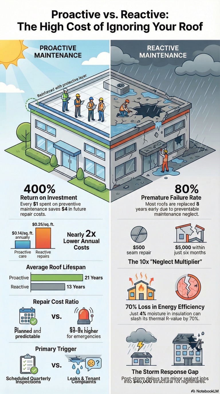 Commercial roofing is one of the most common examples. Large roof areas can be difficult to assess efficiently from the ground, while thermal imaging may help reveal patterns that support closer inspection.